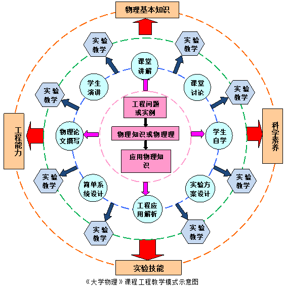 该教学模式的整体思路为:课堂内以加载了工程与应用背景的教学内容为基础,采用具有能力培养针对性的理论教学方法,课堂外以能力培养为导向,运用学生主动型实验教学方式,实现大学物理理论与实验教学的创新,以《大学物理》课程为载体达到对学生知识、能力与素养的全面培养。