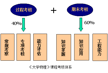我们将学生的课程知识、工程能力、个人能力与科学素养等融入到课程的考核中,并针对学生学习过程与学习效果两方面进行评估,设计出了“实时过程考核和综合期末考核”相结合的《大学物理》课程考核体系,将评估贯穿到课程学习的全过程。