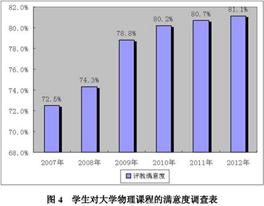 我们在本校2010级、2011级、2012级和2013级理工专业学生的大学物理课程教学中应用了我们提出的CDIO工程教学模式,学生人数近8000人。经过四年多的改革,教师明显感到自己对物理学的认识加深了,自身教学水平得到了提高,学生逐渐端正了对大学物理课程的认识,学生学习兴趣普遍增加,课程的整体教学质量逐步提高。近几年学生对我校大学物理课程教学的满意度调查结果表明,学生对课程与教学的认可程度逐年增长。