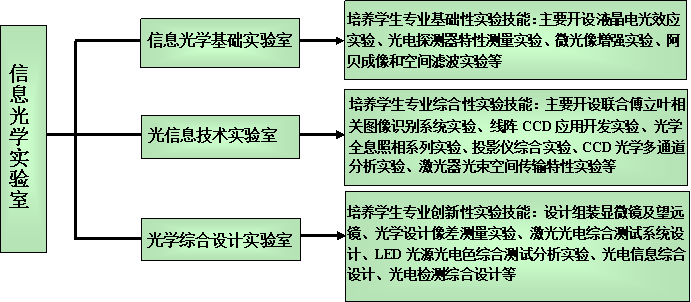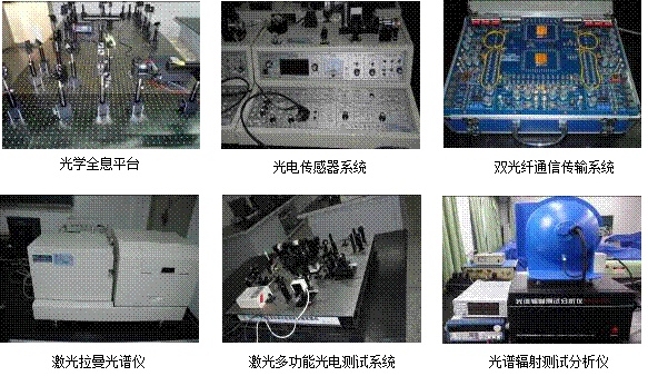 信息光学实验室配置有光电传感技术和光电检测类、信息光学和光学图像处理类、光纤技术及光纤通信类和光谱学与光电精密测试类等实验设备。