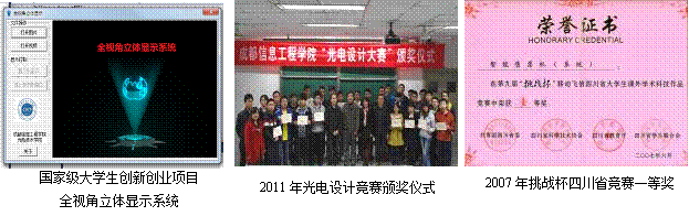 面对高校人才培养的新任务和新挑战,我院积极探索学生主动型实验教学模式,实施实验过程化综合评价体系,同时以学生课外科技活动为载体,探索出了一套开展学生课外科技活动、提高大学生创新能力的模式,组织开展了光电设计竞赛、创新性实验研究和科技讲座等形式多样的课外科技活动。近年来,在全国大学生电子设计竞赛、“挑战杯”课外科技作品竞赛、全国大学生创新创业项目等全国竞赛中获国家级一等奖6人次计3项、二、三等奖13人次计7项。