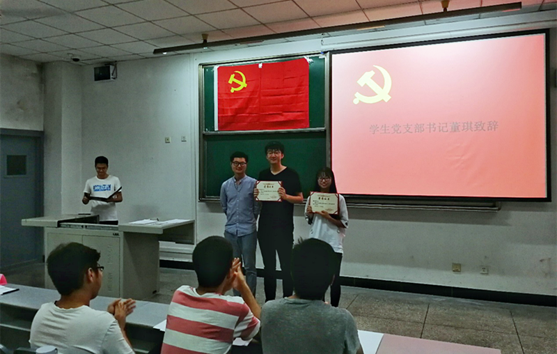 会议第一项,奏唱国际歌。大家庄严肃立,激昂歌唱。会议第二项由董琪老师致辞,董琪老师指出,学生党员应发挥好领头羊的作用,以身作则,做好榜样风范;之后又简单的讲述了学生党支部未来的发展以及构成;会议第三项,由我们的董琪书记给我们的优秀党员梁晓娟同志和万家硕同志进行颁奖并表示祝贺。大会第四项,经过在场正式党员的讨论,一致同意51期9名预备党员转为正式党员;大会第五项,53期积极分子转预备党员,经过在座的党员们的讨论与表决,一致同意53期15名积极分子转为预备党员,为党注入了新鲜的血液。大家庄严的在党旗下宣誓,加入党的队伍永不叛党,为党和人民奋斗终身。