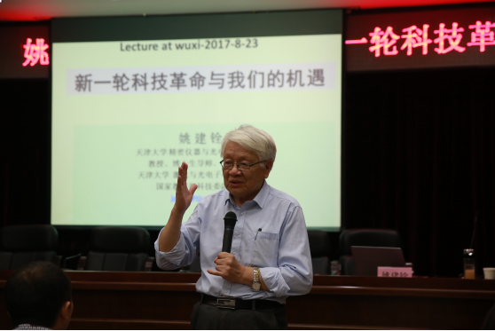 姚建铨院士首先从自身的五个科研方向“激光与非线性光学”、“太赫兹技术”、“微纳光电子器件”、“物联网及智慧城市”和“智慧海洋和智慧空天”出发,分析了2017年科学技术发展的新趋势,科技创新活动的新模式和全球创新格局调整的新问题;然后简要介绍“激光致声通信实验”的研究进展,阐述了当前实验面临难题,诸如“波浪对通信的影响”、“海水盐度和浑浊度对信号传播的影响”等问题,最后引用雨果名言“与有待创造的东西相比,已经创造出来的东西是微不足道的”,强调科技创新的前沿永无止境,鼓励我们要准确把握世界科技发展新趋势,树立创新自信,抢抓战略机遇,为实现中华民族伟大复兴的中国梦提供强有力科技支撑。