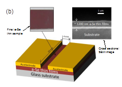 传统上,非晶硒辐射探测器使用较厚的非晶硒膜(厚度可达几十至几百微米),导致器件工作温度低(仅50℃以下可稳定工作),驱动电压大(一般高达几十伏特/微米)。为此,本项工作探索了热蒸发技术在低真空度下制备非晶硒薄膜的工艺,并最终制备成功非晶硒薄膜辐射探测器(膜厚仅为1200纳米),该探测器在“0.25伏特/毫米”的低驱动电场下即获得明显的X射线辐射响应,且材料的工作温度提高至60℃。本项工作为制备具有更高工作温度、更低驱动电压的非晶硒薄膜X射线探测器提供了可能。