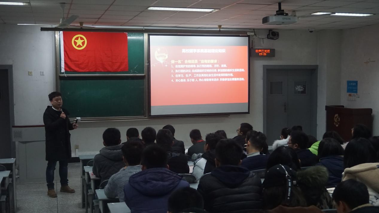 2017年12月15日晚上7点365bet足球开户团校第二期第六讲在1309教室开展。365bet足球开户第二期团校第六次团课由我院团委书记鲁波为我院各级团干部、团员以及各优秀准共青团员授课,主题为“学院主要团学工作”。